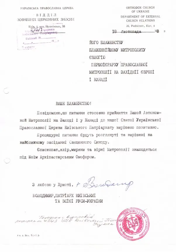 Розуміючи нагальну потребу українців діаспори у власній самокерованій церковній структурі, Патріарх Володимир приділив цьому питанню увагу одразу після своєї інтронізації. Вже 18 листопада 1993 року Патріарх офіційно засвідчив: «Єпископат, клір, вірні митрополії знаходяться під моїм архіпастирським омофором».